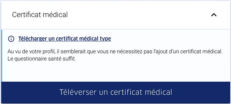 En fonction de votre situation, choisissez de téléverser un certificat médical, ou de valider le questionnaire de santé :